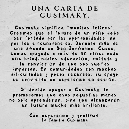 Iniciado como un pequeño proyecto en 2015 por Yenifer Calderón, Cusimaky creció hasta convertirse en algo mucho más grande que una organización benéfica. Se convirtió en una comunidad, un hogar y una voz para el pueblo del Cusco y el distrito de San Jerónimo.